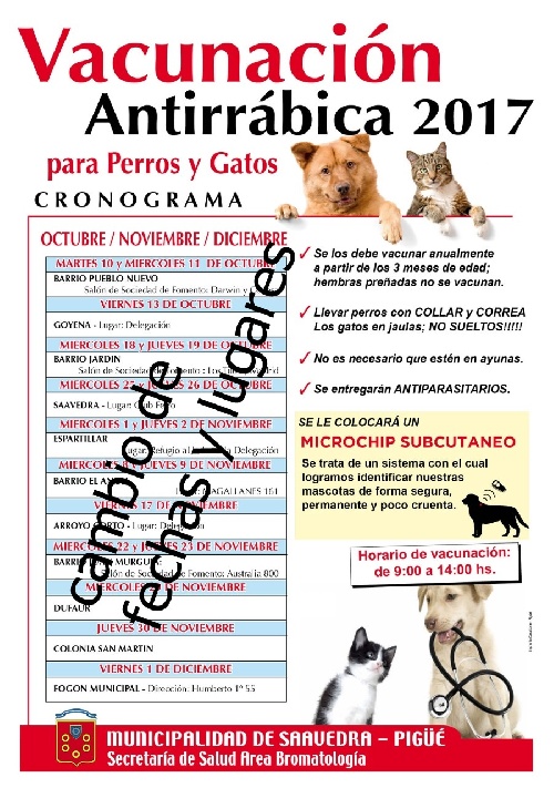 Bromatología municipal informó que consecuencia de no llegar las vacunas antirrábicas desde zoonosis provincial, se ha reprogramado las fechas de la campaña anual. Recordamos que esta vacunación es obligatoria para perros y gatos, y la reprogramacion a confirmadolas siguiente fechas y lugares:
