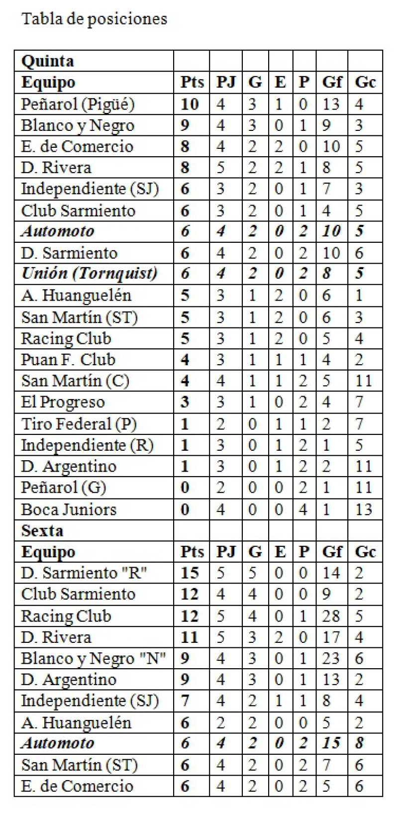 Quinta: Racing Club 2 vs. San Martín de Carhué 2; Peñarol de Pigüé 3 vs. Deportivo Sarmiento 1; Blanco y Negro 1 vs. Empleados de Comercio 2; Automoto 5 vs. El Progreso 1; Independiente de Rivera 0 vs. Puan F. Club 0; Tiro Federal de Puan 1 vs. Deportivo Rivera 1 e Independiente de San José 1 vs. Unión de Tornquist 0. Libres: Boca Juniors, Atlético Huanguelén, Peñarol de Guaminí, Deportivo Argentino, Club Sarmiento y San Martín de Santa Trinidad.