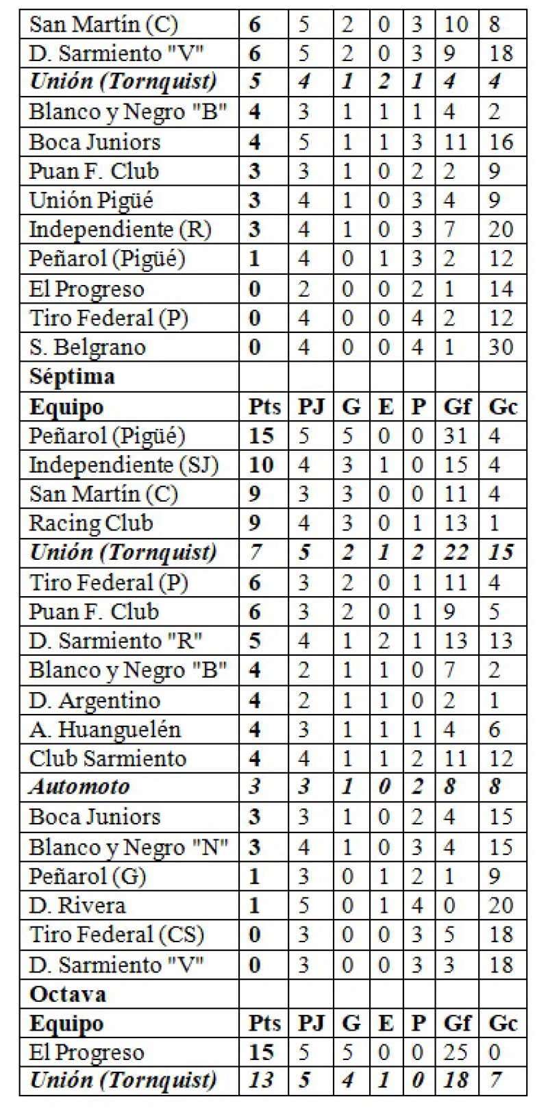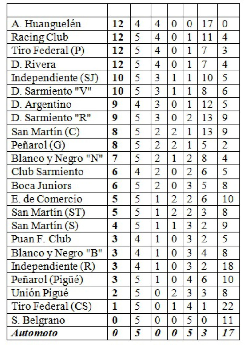 Sexta: Racing Club 1 vs. San Martín de Carhué 0; Peñarol de Pigüé 1 vs. Deportivo Sarmiento “Rojo” 2; Blanco y Negro “Blanco” 3 vs. Empleados de Comercio 0; Automoto 10 vs. El Progreso 0; Independiente de Rivera 1 vs. Puan F. Club 2; Deportivo Argentino 3 vs. Unión Pigüé 0; Tiro Federal de Puan 1 vs. Deportivo Rivera 4; Deportivo Sarmiento “Verde” 1 vs. Club Sarmiento 5 e Independiente de San José 1 vs. Unión de Tornquist 1. Jugado el 12/4: Boca Juniors 8 vs. Sportivo Belgrano de Espartillar 0. Libres: Atlético Huanguelén, Blanco y Negro “Negro” y San Martín de Santa Trinidad.