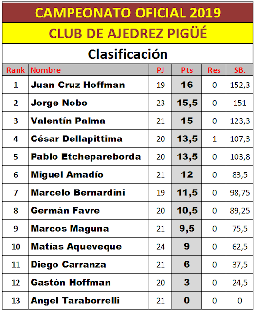 Marcos Maguna, volvió a dar la nota en el certamen oficial al derrotar a Juan Cruz Hoffman con piezas Negras en 26 jugadas de una Apertura Reti, la partida se desarrollaba en total paridad pero el “olvido” de un Alfil Blanco en a3 y la posterior captura por parte de la Dama Negra, inclinó decididamente la balanza hacia Maguna en la jugada 20, el Blanco siguió jugando hasta la jugada 26, donde el analizador daba una diferencia de 8.88 a favor de Maguna por lo que el Rey Blanco dimitió.
