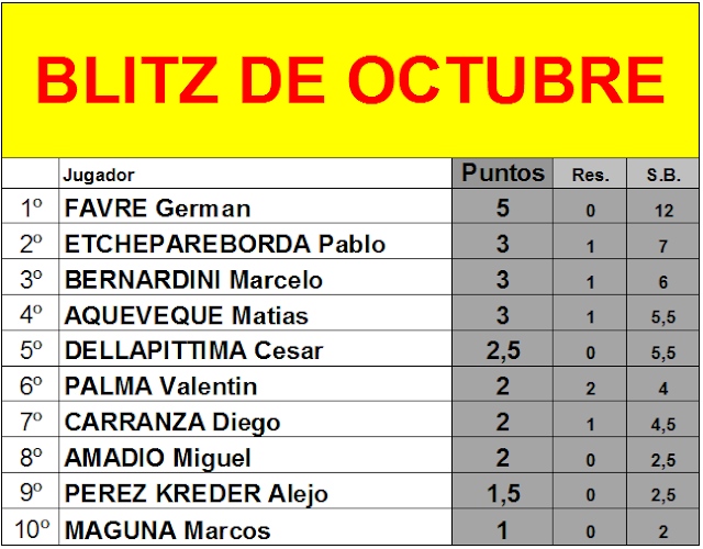 Germán Favre, con puntaje ideal, se vistió de ganador del Blitz de Octubre. El ganador sumó 5 puntos, sacándole 2 de ventaja a su inmediato perseguidor.