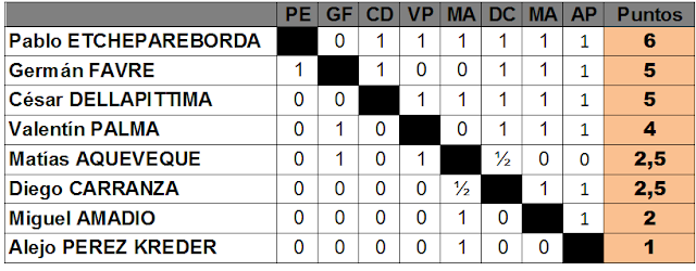 Pablo Etchepareborda se impuso en el Blitz a 10 minutos por el sistema Round Robin que se jugó el pasado martes en el Club de Ajedrez. El ganador sumó 6 puntos cayendo en segunda ronda ante Germán Favre que finalizó segundo con 5 puntos, el tercer lugar quedó en poder de Dellapittima que sumó también 5 puntos.
