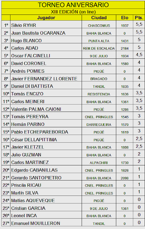 Silvio Fernando Ryhr, ex campeón del Club de Ajedrez Pigüé, y ahora radicado en Chascomus, se impuso en la XIII edición del Torneo Aniversario que este año, por la pandemia, se realizó de manera on line.