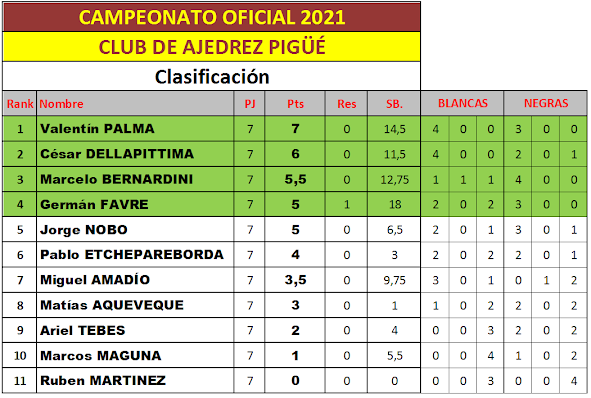 César Dellapittima lo sigue en la tabla tras superar con piezas Blancas a Jorge Nobo en 15 jugadas de una Defensa de los dos Caballos, Ataque Max Lange.