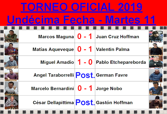 Jorge Nobo con piezas Negras venció a Marcelo Bernardini y continua al frente de las posiciones del Torneo Oficial al jugarse parcialmente la Undécima Fecha.